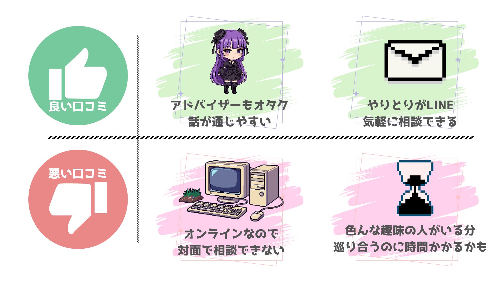 | 各社の特徴 | サブカルに特化 | カウンセラーの質にこだわり | 充実したサポート | 有名Youtuber監修 |