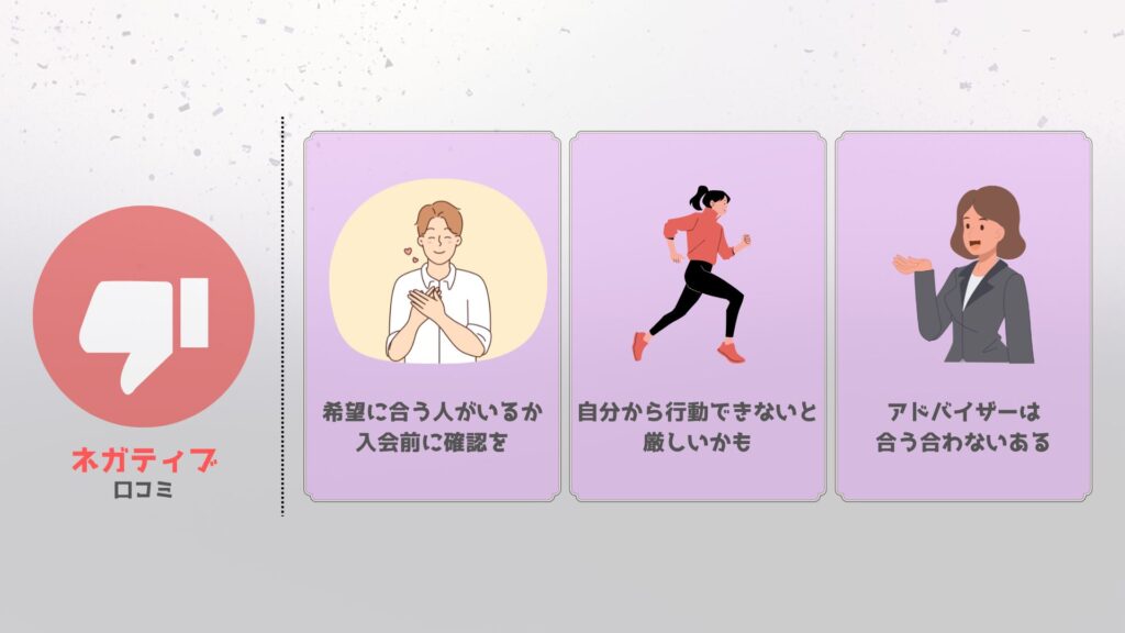 アドバイザーは高評価が目立った一方、当然ながら「合わない」という口コミも散見されました。