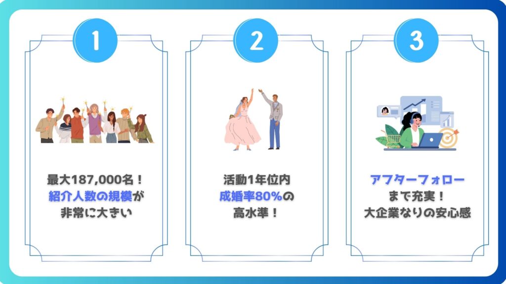 - 3つの結婚相談所連盟に加入しており、最大187,000名の会員を紹介可能