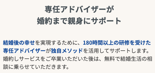 また、婚活中の相談だけでなく、結婚後のアフターフォローまで掲げており、まさに至れり尽くせりのサービスです。